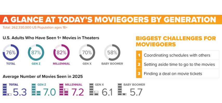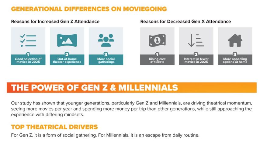 Poređenje generacija ukazuje da nije isto ni ponašanje, ni motivi među njima. Kod Generacije Z raste interesovanje za projekcije filmova, zato što smatraju da su u 2025. na repertoaru bili dobri naslovi. Oni žele bioskopsko iskustvo van kuće i raduju se društvenoj interakciji. Na drugoj strani, Generacija X je manje izlazila, jer im smetaju skuplje karte, nisu bili oduševljeni izborom filmova i više su se opredeljivali za opcije neke zabave kod kuće.