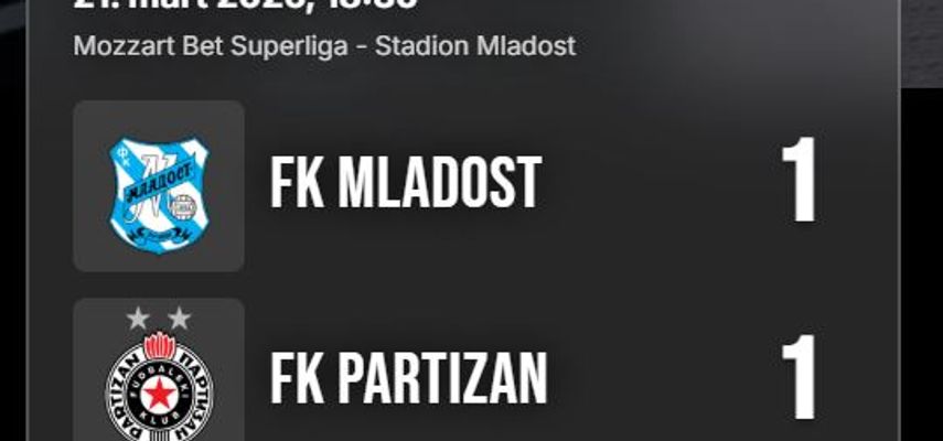Fudbaleri Mladosti i Partizana odigrali su danas u Lučanima nerešeno 1:1, u utakmici 28. kola Super lige Srbije.
