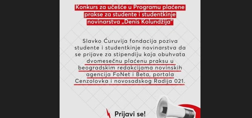 Slavko Ćuruvija fondacija najavila je danas da se studenti novinarsta mogu do 11. maja prijaviti za program plaćene prakse za studente novinarstva "Denis Kolundžija" u beogradskim redakcijama novinskih agencija FoNet i Beta, portala Cenzolovka i novosadskog Radija 021.