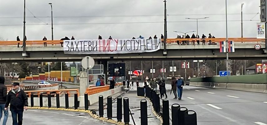 Studenti koji blokiraju beogradske fakultete danas su na nadvožnjaku iznad Mostarske petlje razvili transparent "Zahtevi nisu ispunjeni".